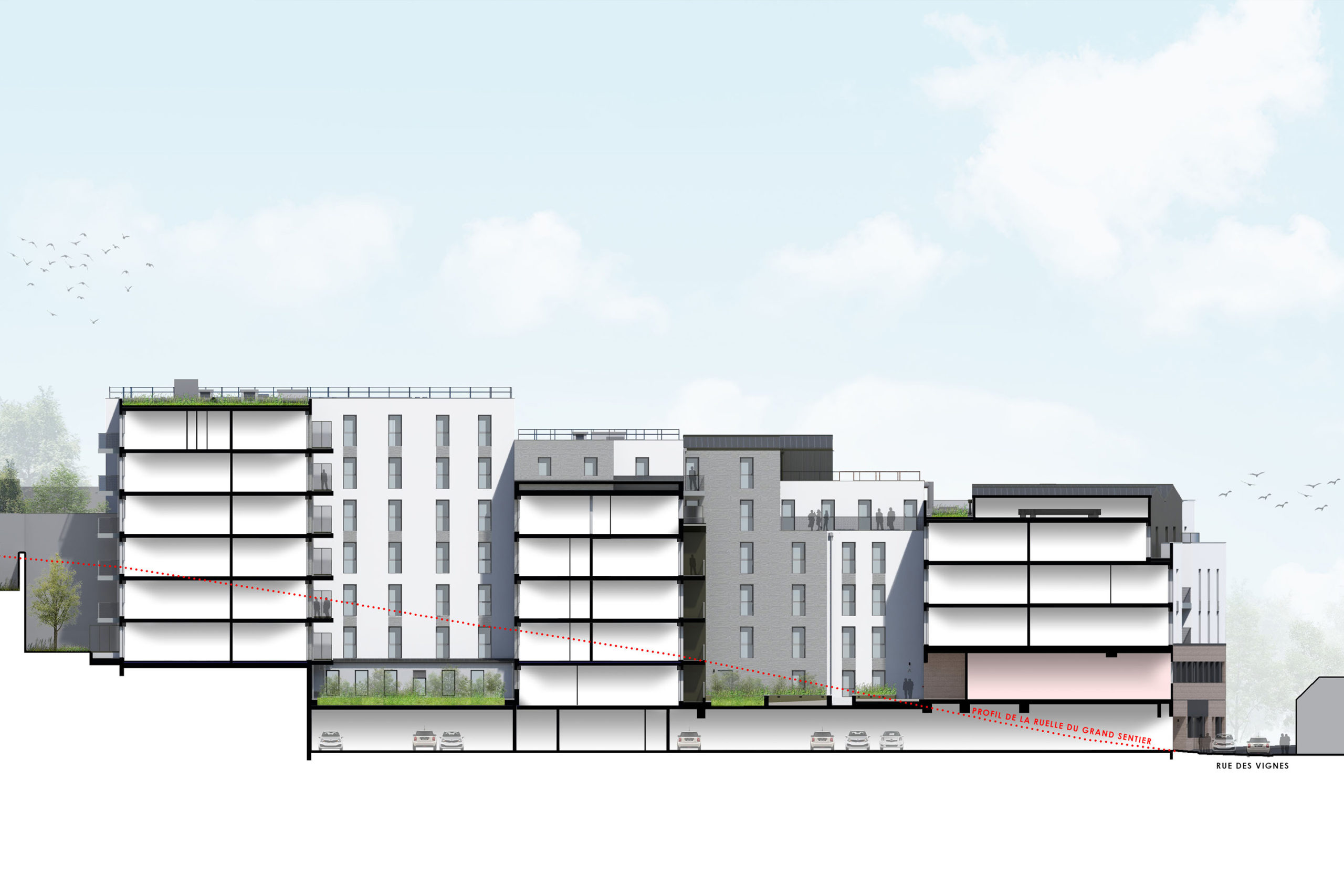 L’ensemble du bâtiment se développe suivant des gabarits échelonnés en suivant le dénivelé du terrain. Cette composition épannelée permet de dégager de larges terrasses végétalisées.