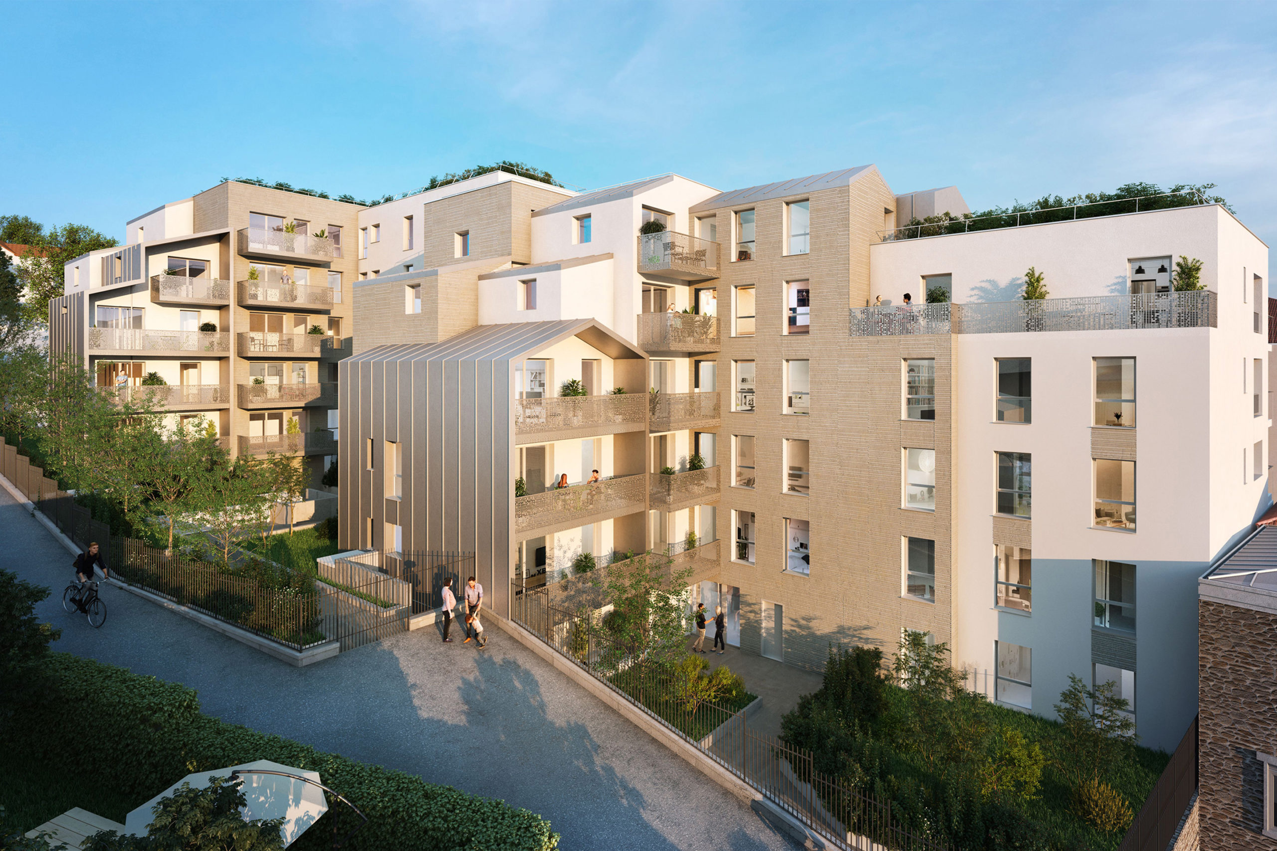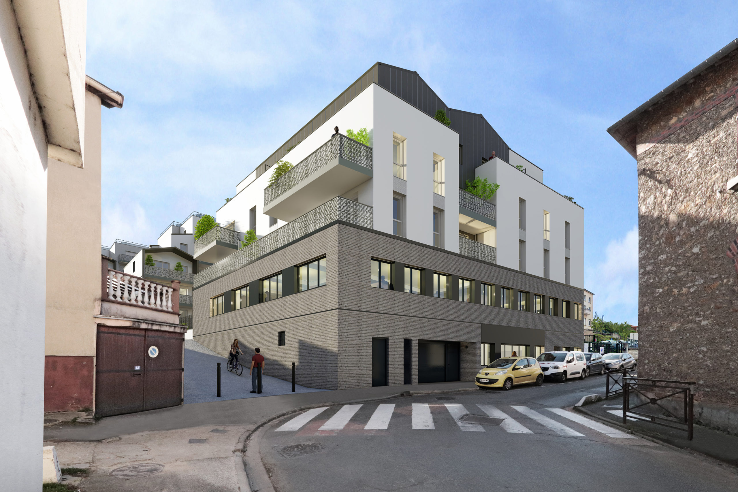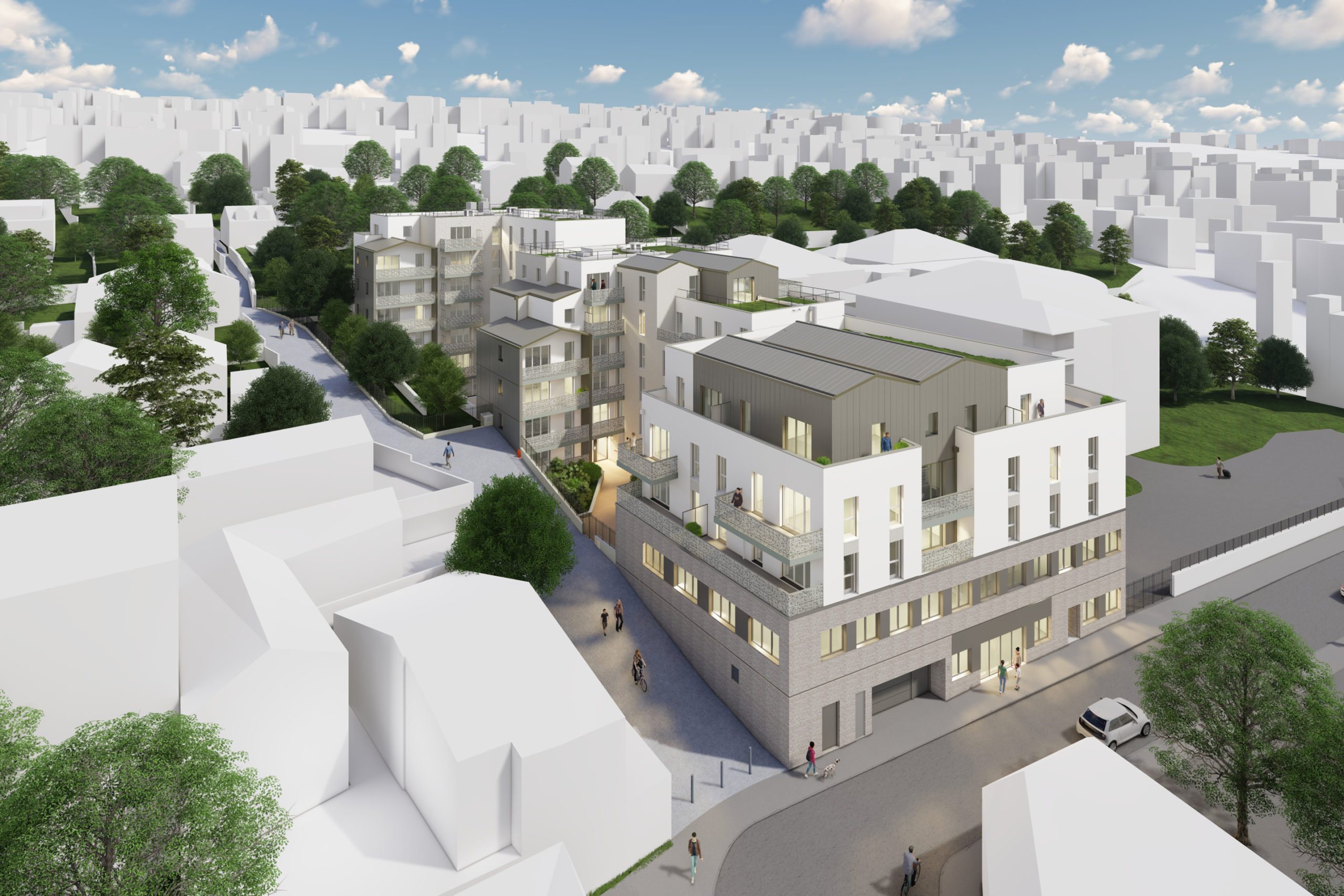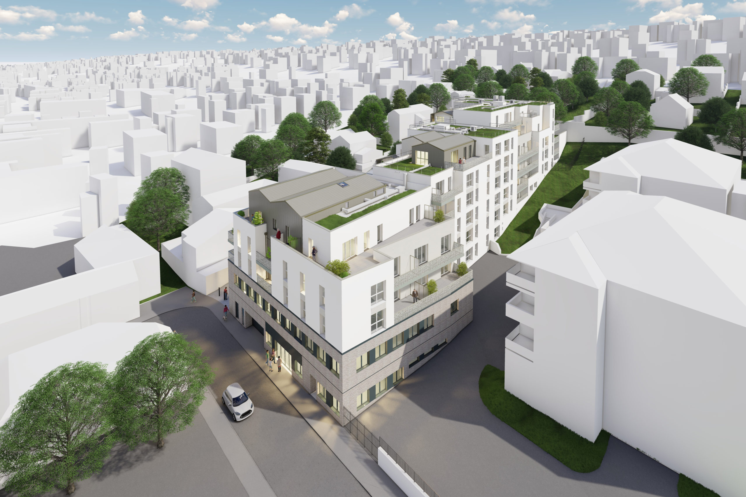 L’introduction de toitures en pente couvrant certains volumes de la construction permettant un dialogue évident avec les bâtis environnants et une volumétrie riche en séquences, volumes et fragmentations.