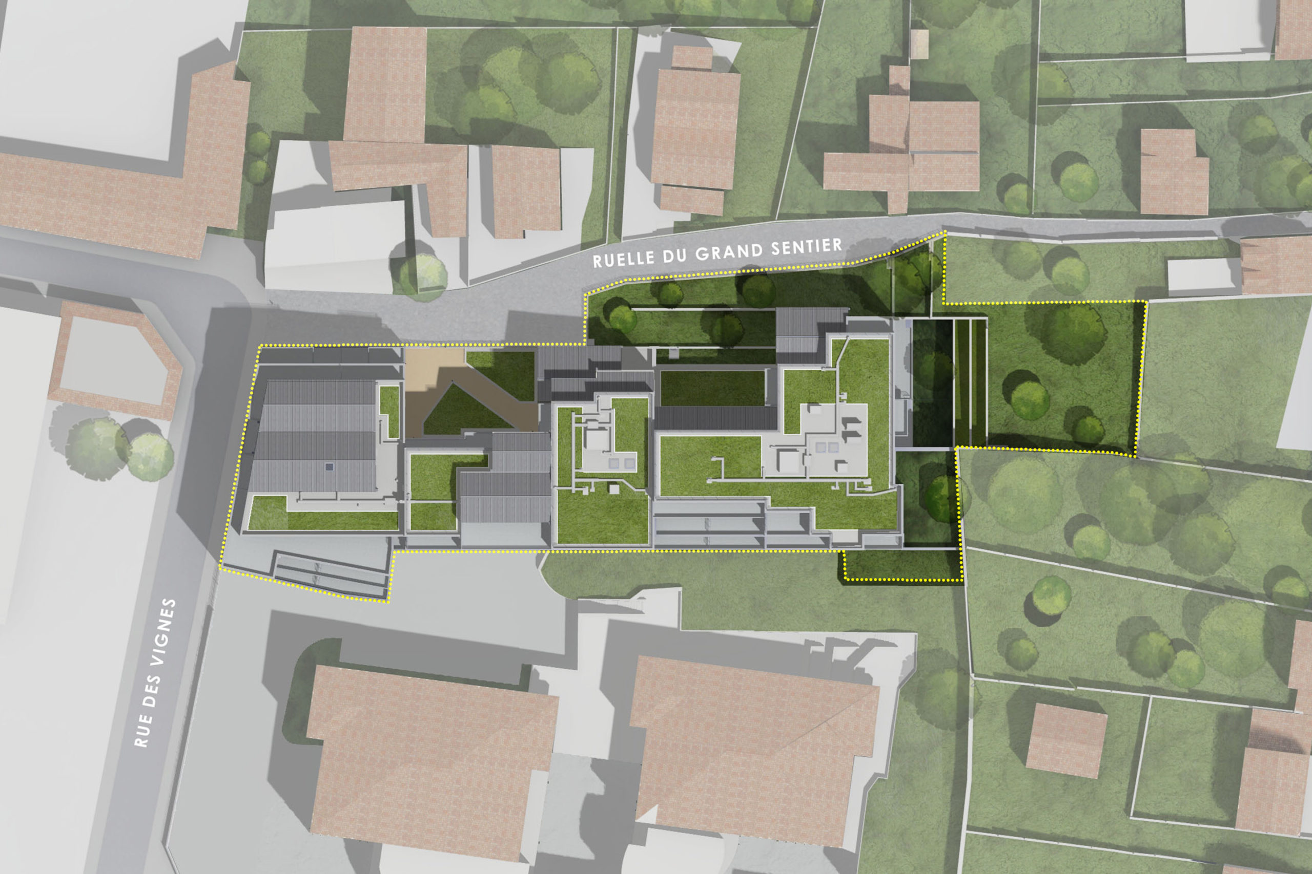Les deux ailes en retour du corps principal présentent des retraits successifs liés aux prospects pris depuis la sente ; ces retraits et épannelages sont façonnés de manière à trouver un écho aux volumétries pavillonnaires voisines.